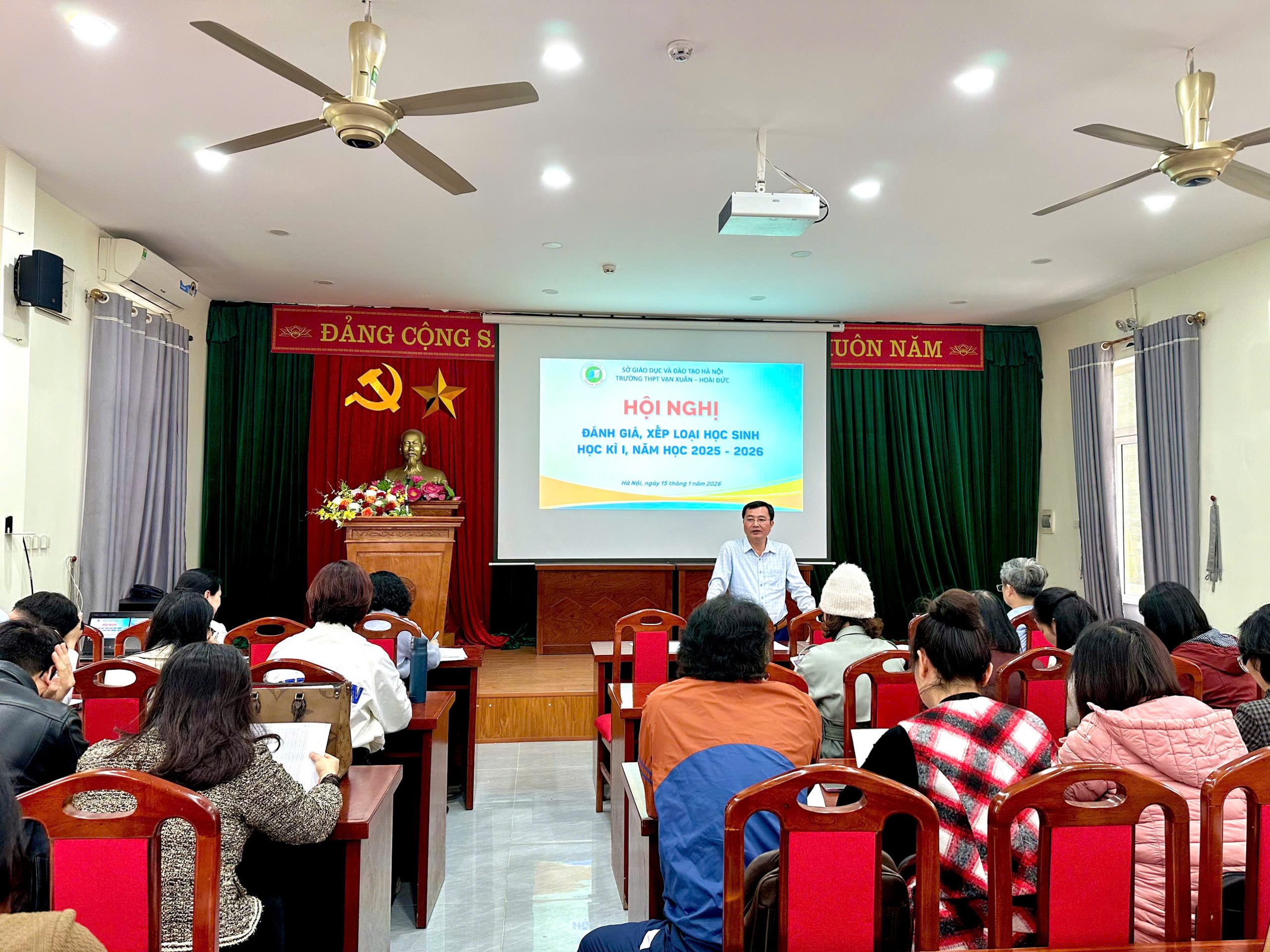 Sáng ngày 15/01/2026, trường THPT Vạn Xuân – Hoài Đức đã tổ chức Hội nghị đánh giá, xếp loại học sinh học kỳ I năm học 2025 – 2026. Hội nghị nhằm đánh giá khách quan, toàn diện kết quả học tập và rèn luyện của học sinh sau học kỳ I, đồng thời làm căn cứ triển khai các nhiệm vụ trọng tâm trong học kỳ II. Tham dự hội nghị có Ban Giám hiệu nhà trường và giáo viên chủ nhiệm của 41 lớp. Hội nghị được tổ chức nghiêm túc, đảm bảo tính công bằng, khách quan và thống nhất trong công tác đánh giá, xếp loại học sinh.