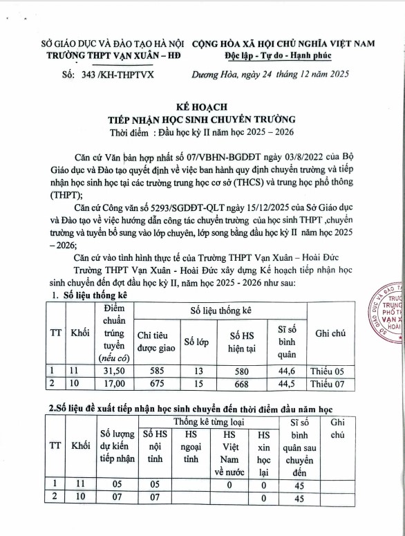 Trường THPT Vạn Xuân – Hoài Đức xây dựng Kế hoạch tiếp nhận học sinh chuyển đến đợt đầu học kỳ II, năm học 2025 – 2026 như sau: Xem chi tiết kế hoạch tại file: KH Tiếp nhận HS chuyển trường HK II