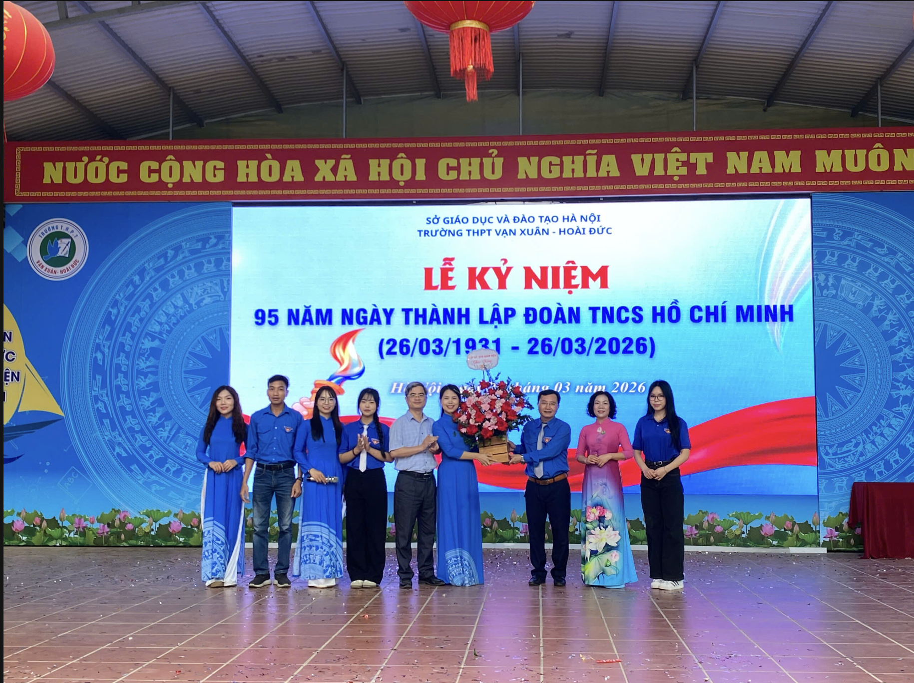 Sáng ngày 26/03/ 2026, Trường THPT Vạn Xuân – Hoài Đức đã long trọng tổ chức Lễ Kỷ niệm 95 năm ngày thành lập Đoàn TNCS Hồ Chí Minh (26/03/1931 – 26/03/2026). Đây là dịp để cán bộ, giáo viên và học sinh toàn trường cùng ôn lại truyền thống vẻ vang của Đoàn Thanh niên Cộng sản Hồ Chí Minh, qua đó bồi dưỡng niềm tự hào, lý tưởng sống đẹp, tinh thần xung kích, sáng tạo của tuổi trẻ trong học tập và rèn luyện, góp phần xây dựng quê hương, đất nước ngày càng phát triển. Tham dự buổi lễ có các đồng chí trong Chi bộ Đảng, Ban Giám hiệu nhà trường, Ban Chấp hành Đoàn trường, các thầy cô giáo trong Hội đồng sư phạm cùng toàn thể cán bộ, nhân viên và học sinh toàn trường.