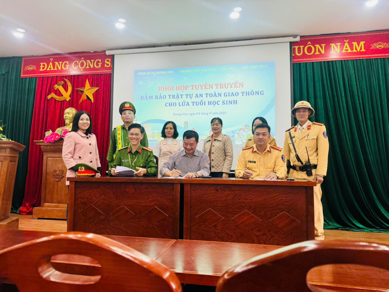 Trong buổi làm việc, đại diện Đội Cảnh sát Giao thông số 9 công an thành phố Hà Nội và công an xã Dương Hòa đã thông tin về tình hình giao thông trên địa bàn, những vi phạm thường gặp ở lứa tuổi học sinh và nhấn mạnh tầm quan trọng của việc chấp hành luật giao thông như một nét đẹp văn hóa ứng xử nơi công cộng. Đồng thời, lực lượng CSGT và nhà trường thống nhất tăng cường phối hợp giáo dục, giám sát, tuyên truyền thường xuyên để hình thành nếp sống văn minh, an toàn cho học sinh khi tham gia giao thông.