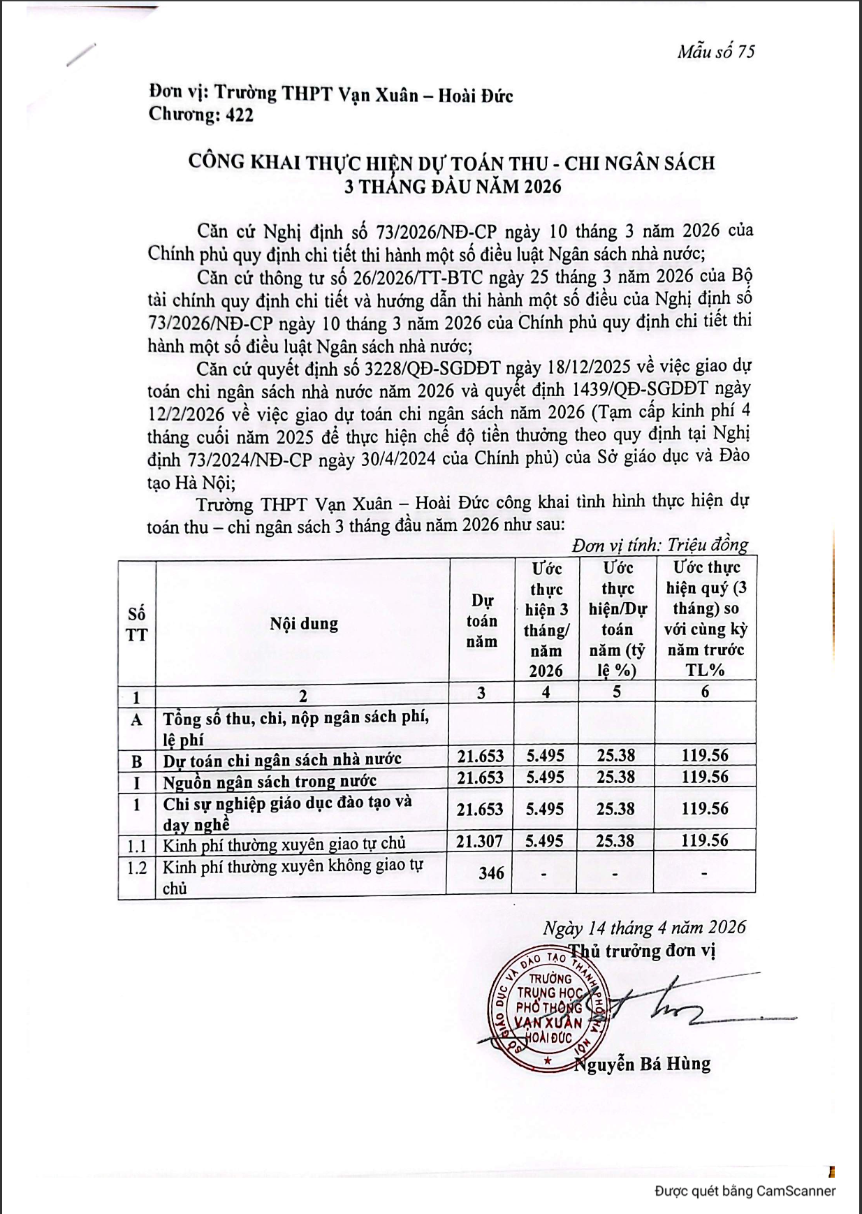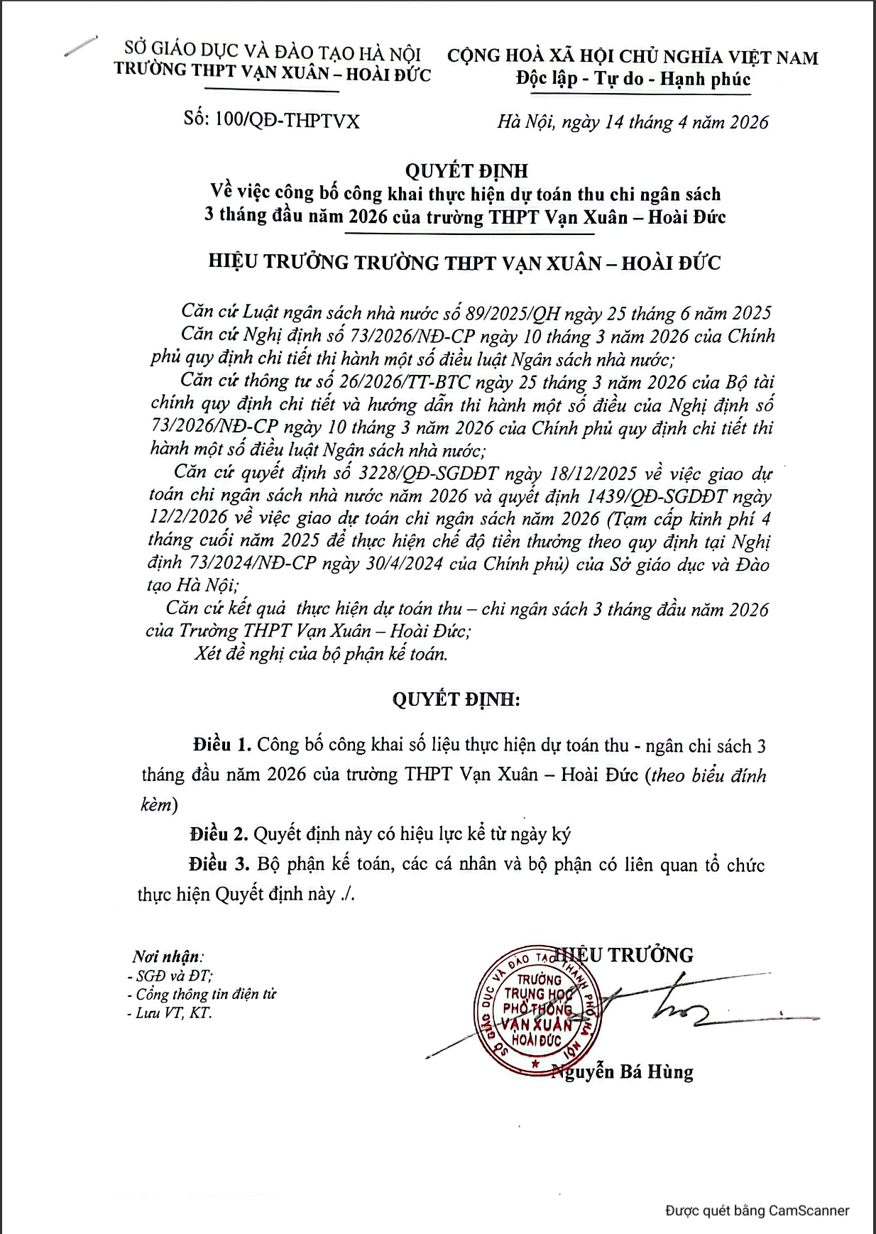 Quyết định Số 100/QĐ – THPTVX về việc công bố công khai thực hiện dự toán thu chi ngân sách 3 tháng đầu năm 2026 của trường THPT Vạn Xuân – Hoài Đức Ngày đăng: 15/04/2026 Xem chi tiết tại file: Cong khai tinh hinh thuc hien ngan sach quy 1-2026 Các tin liên quan Quyết định Số 101/QĐ-THPTVX về việc công bố công khai dự toán chi ngân sách nhà nước năm 2026 của trường THPT Vạn Xuân – Hoài Đức Kế hoạch số 87/KH-THPTVX về công tác tuyển sinh vào lớp 10 trung học phổ thông năm học 2026 – 2027 LỄ KỶ NIỆM 95 NĂM NGÀY THÀNH LẬP ĐOÀN TNCS HỒ CHÍ MINH (26/03/1931 – 26/03/2026) Quyết định Số 24 /QĐ-THPTVX về việc công bố công khai dự toán chi ngân sách nhà nước năm 2026 KẾ HOẠCH KHẢO SÁT LẦN 1 LỚP 12_NĂM HỌC 2025-2026