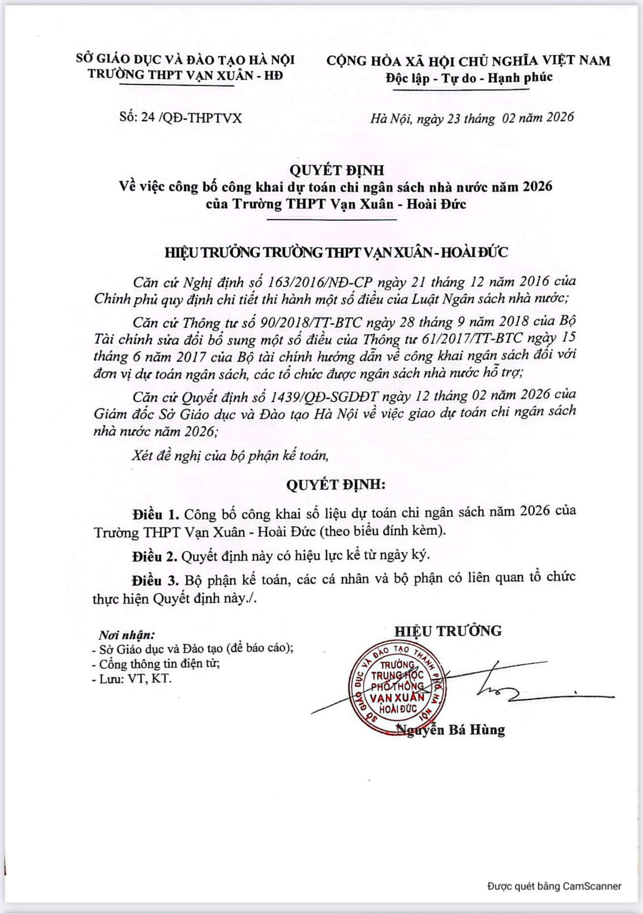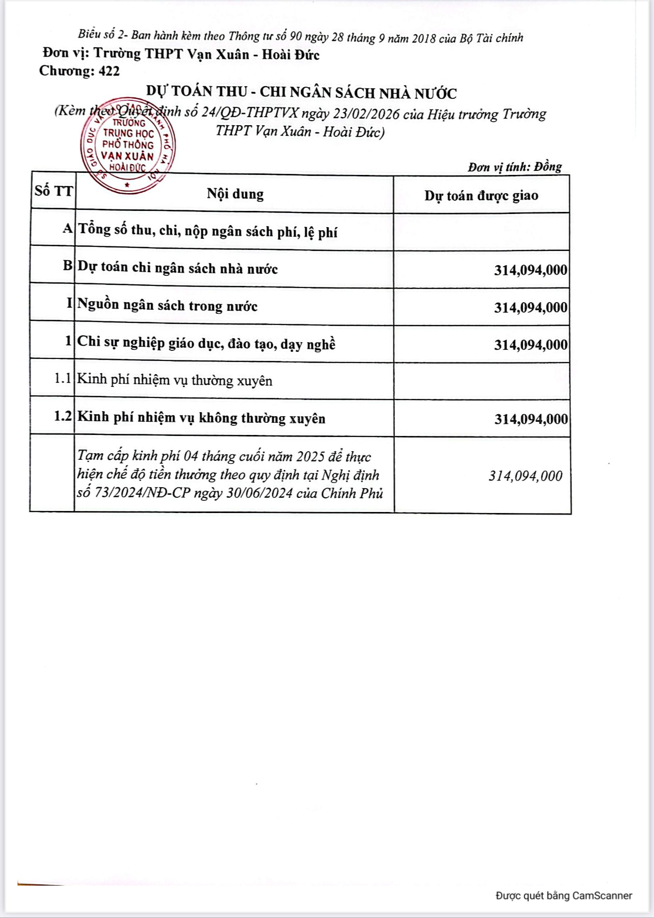 Quyết định Số 24 /QĐ-THPTVX về việc công bố công khai dự toán chi ngân sách nhà nước năm 2026