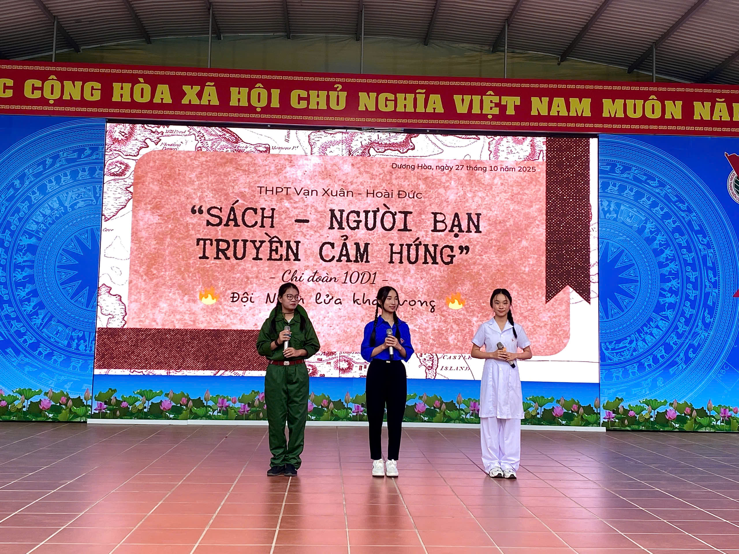 📖 Trong nhịp sống hiện đại, khi công nghệ len lỏi vào từng khoảnh khắc của cuộc sống, việc đọc sách tưởng chừng như bị thế hệ trẻ dần lãng quên. Thế nhưng, tại Trường THPT Vạn Xuân – Hoài Đức, ngọn lửa của niềm yêu sách vẫn đang cháy rực rỡ, được thắp lên bằng đam mê và tinh thần sáng tạo của thầy và trò nhà trường. Nhằm lan tỏa văn hóa đọc, giúp học sinh rèn luyện tư duy, kỹ năng thuyết trình và khả năng sáng tạo nghệ thuật, Tổ Ngữ văn đã tổ chức chuyên đề “Sách – Người bạn truyền cảm hứng” vào ngày 27 tháng 10 năm 2025. Ba đội thi mang ba sắc màu riêng biệt – Văn, Trí, Dũng – tượng trưng cho ba phẩm chất làm nên con người toàn diện. Mỗi đội là một mảnh ghép độc đáo, thể hiện những cách cảm nhận khác nhau về giá trị của tri thức và niềm say mê đọc sách.